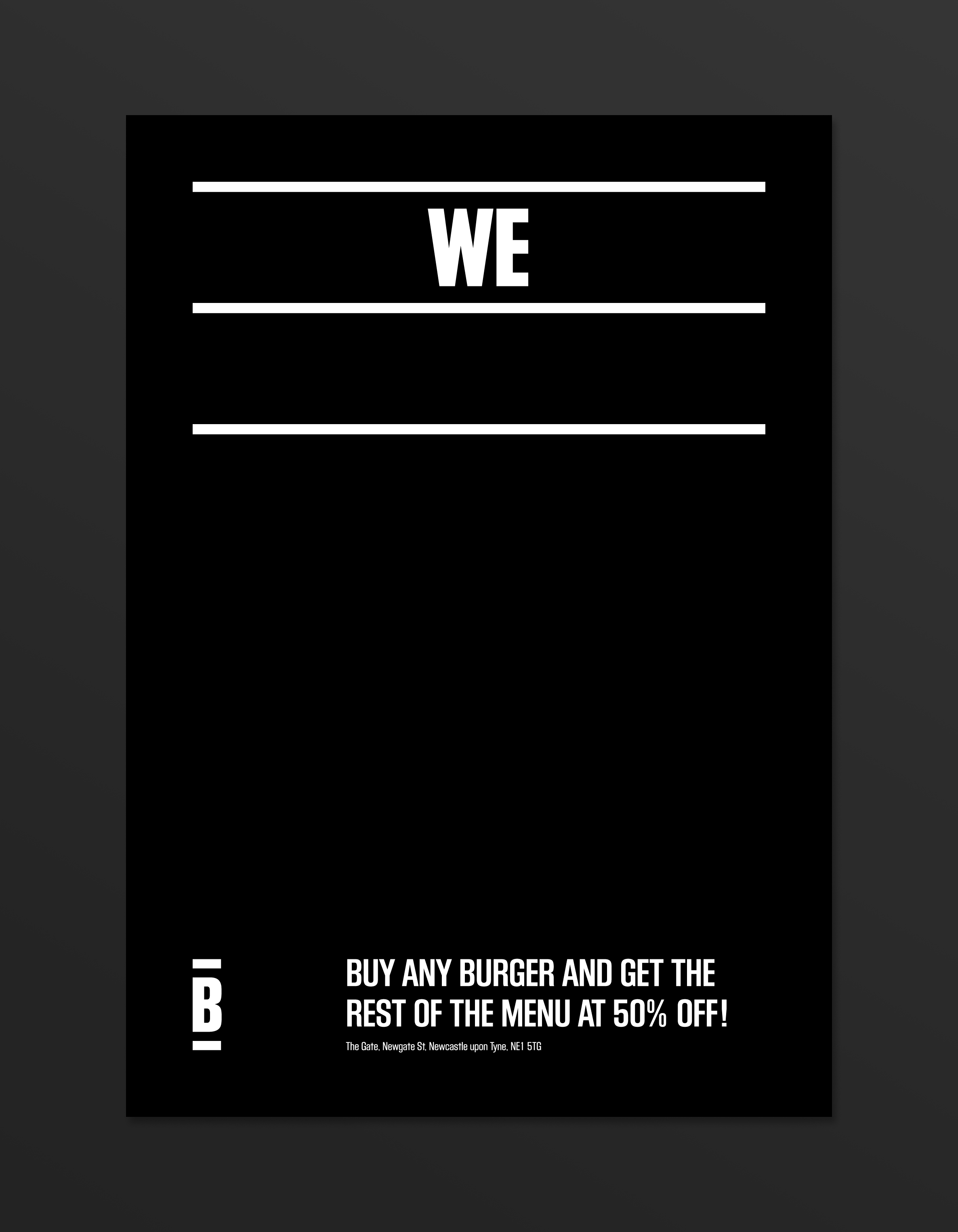 Leading unapologetically with ‘BURGER’ created a sense of ownership over the word in a competitive space. With origins in woodblock printing, the Block Gothic font had the right overtones of craft and robustness. A simple word-mark can condense to a ‘bun’ in its simplest form, and expand horizontally or vertically to let the name do the talking.