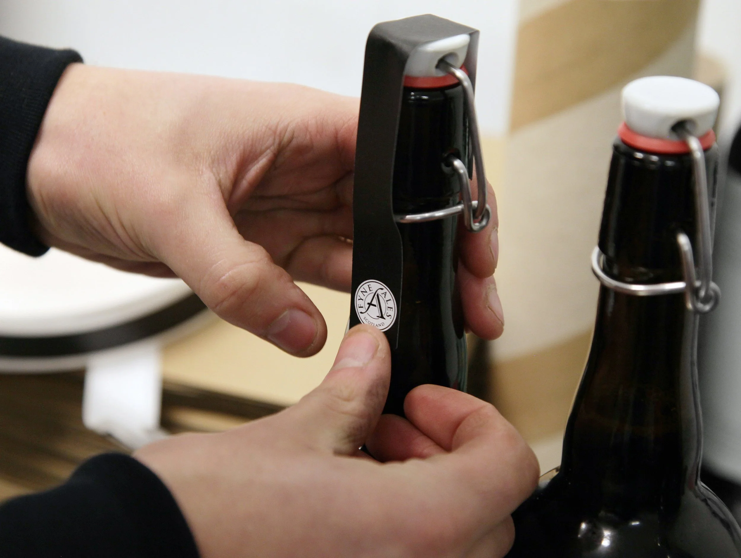 Employee adding labels to Fyne Ales & Brewdog bottles