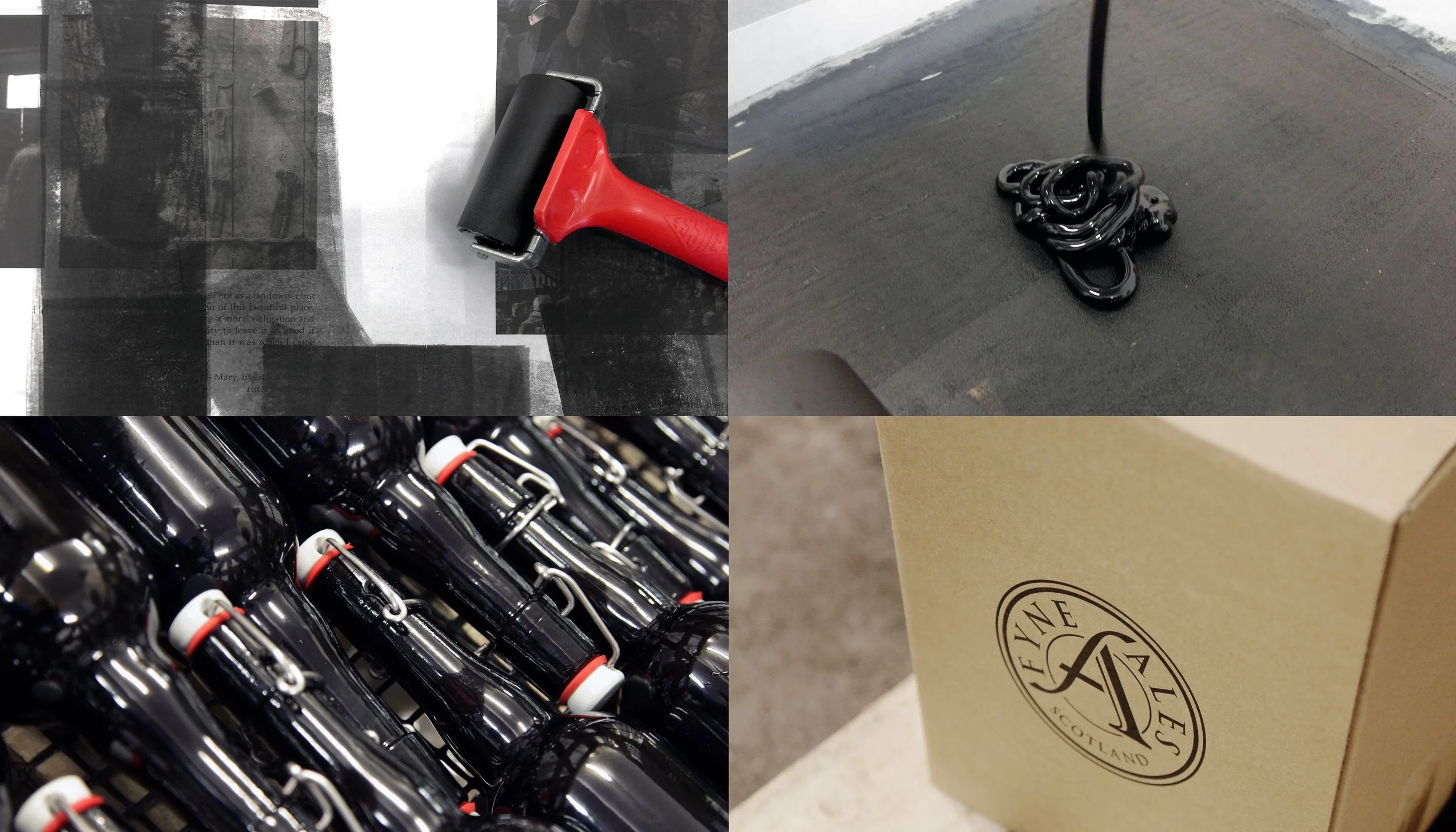 Collage showing the printing, bottles and packaging for Fyne Ales